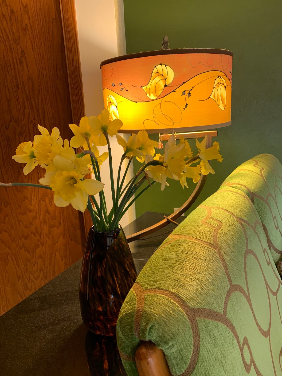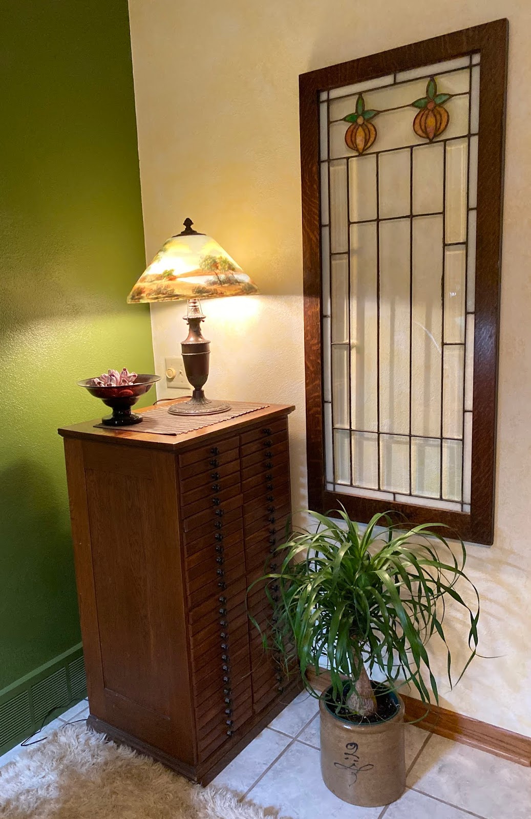 I needed something to help deaden the sound in our sunroom. All of a sudden a bolt of lightning hit and I thought maybe this quilt I had made years before and had planned to display in a totally different way might work. I played with it on the tables in my studio to see if I could make it fit the space. It worked perfectly. It is a 2 sided quilt so I was able to loop it around the pole I used to display it.
